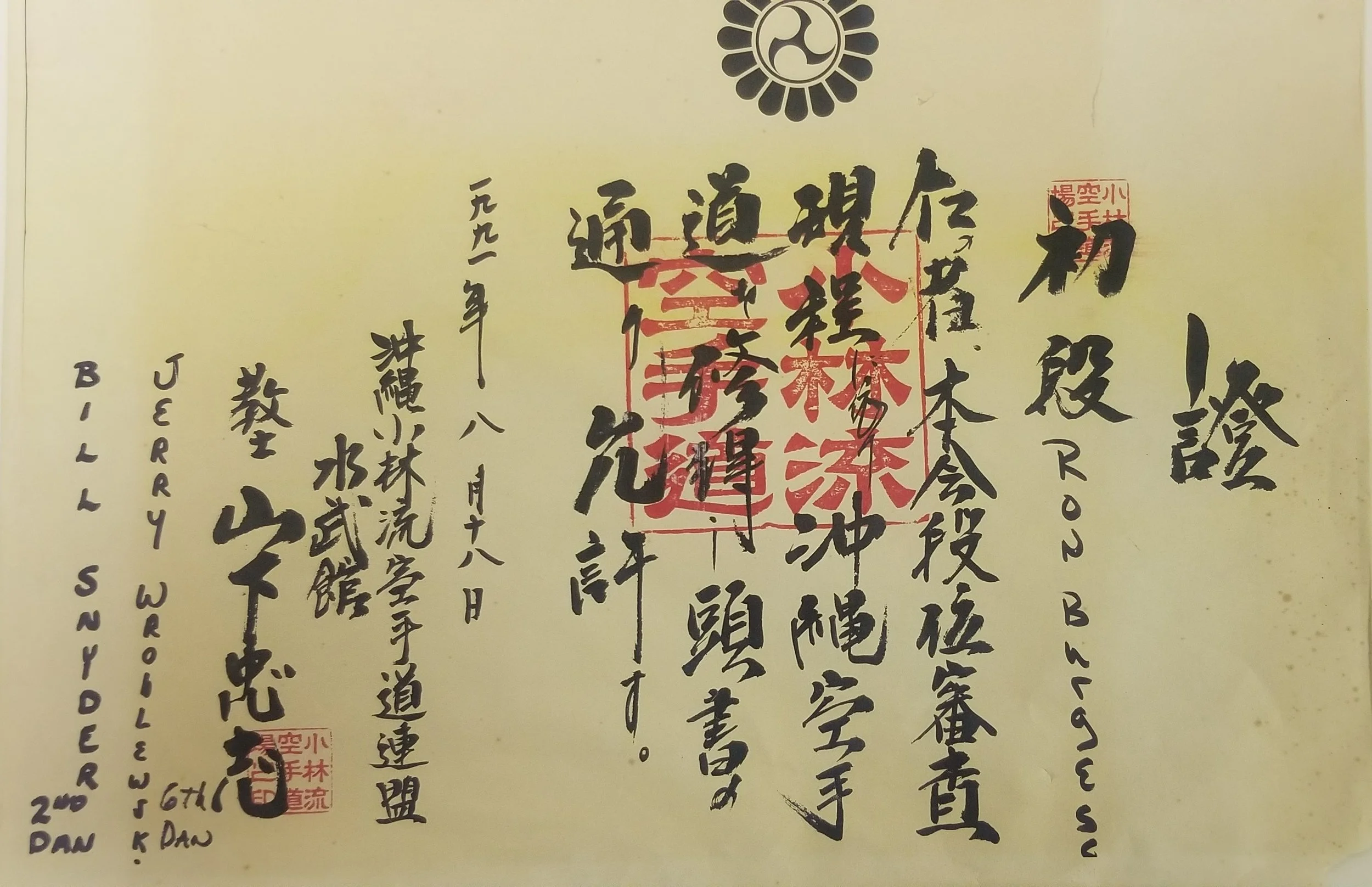 These are pictures of the certificates that remained at Midwest Karate Academy prior to becoming Suibukan, and are displayed here in decreasing rank order. Some of the people listed below have gone on to other styles and levels.
