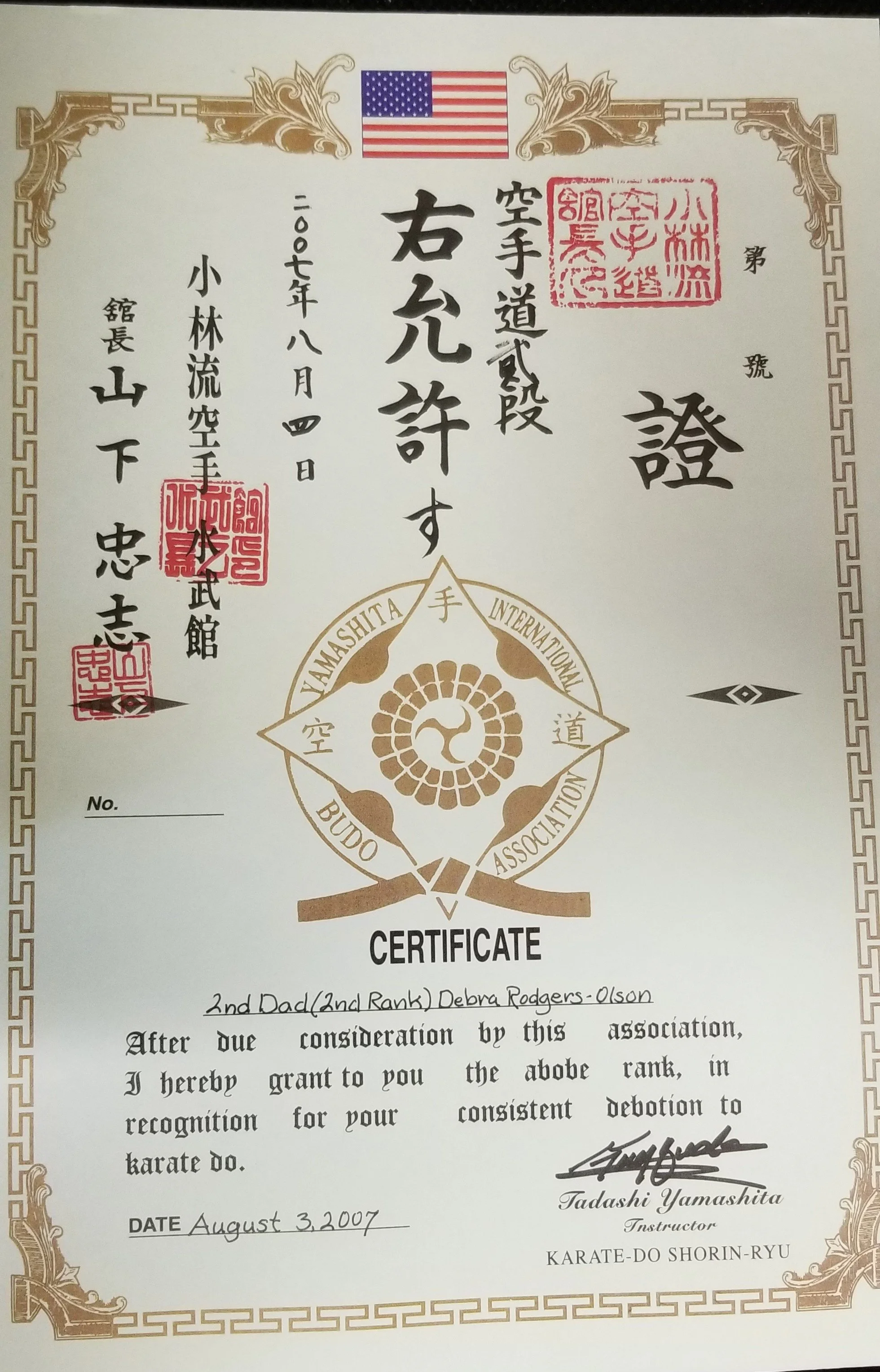 Deb Rodgers-Olson, 2nd Degree Karate August 3, 2007 **Special Note: Sensei Deb and her husband Terry now live in Nebraska and established our sister school, Suibukan of Nebraska. You can find their Facebook page here.